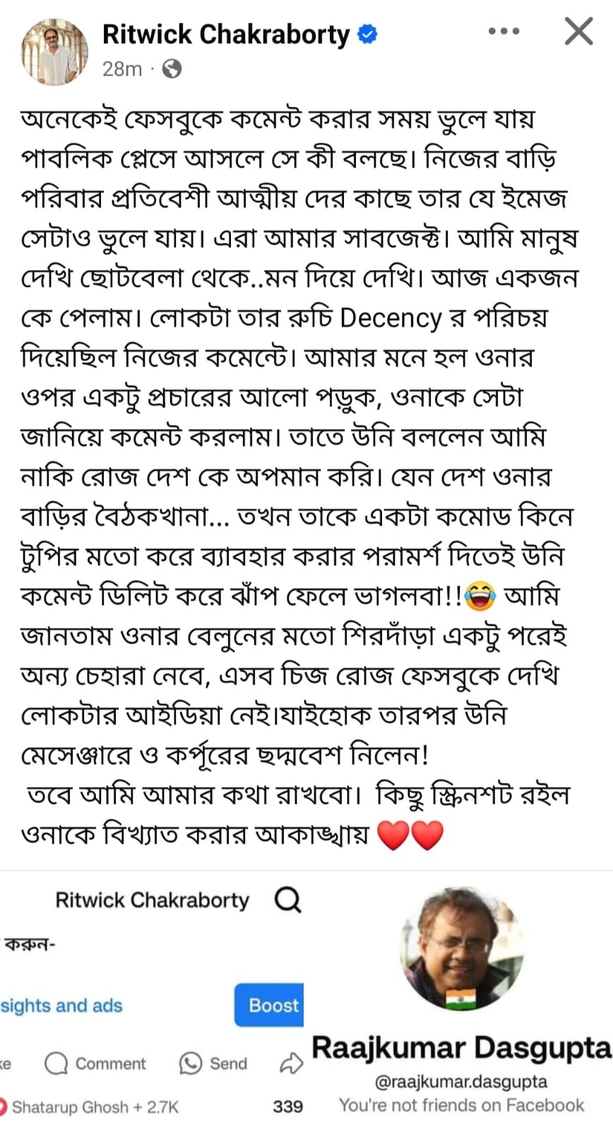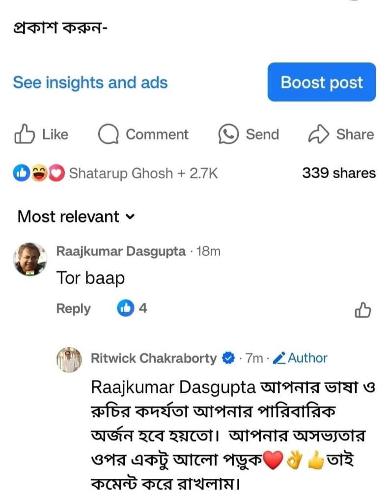 এখানেই থামেননি ঋত্বিক। রাজকুমার দাশগুপ্ত নামের সেই ট্রোলারের ইনবক্সে গিয়ে তাঁকে মেসেজ করেন ‘মৃগয়া’ নায়ক – “আপনাকে একটু বিখ্যাত করে ছাড়বো মাশাই। খুব ভালো থাকবেন।” ( কমেন্টের বানান বানান অপরিবর্তিত রাখা হল) এরপর এদিন নিজের কথা রাখলেন ঋত্বিক। সেই ট্রোলারকে সমাজমাধ্যমে ‘বিখ্যাত’ করে দেওয়ার কথা রাখার ব্যাপারে যে তিনি কোমর বেঁধেই নেমেছেন, তা বুধবার ফেসবুকে করা ঋত্বিকের পোস্ট থেকেই পরিষ্কার।