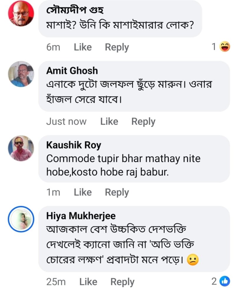 “অনেকেই ফেসবুকে কমেন্ট করার সময় ভুলে যায় পাবলিক প্লেসে আসলে সে কী বলছে। নিজের বাড়ি পরিবার প্রতিবেশী আত্মীয় দের কাছে তার যে ইমেজ সেটাও ভুলে যায়। এরা আমার সাবজেক্ট। আমি মানুষ দেখি ছোটবেলা থেকে..মন দিয়ে দেখি। আজ একজন কে পেলাম। লোকটা তার রুচি Decency র পরিচয় দিয়েছিল নিজের কমেন্টে। আমার মনে হল ওনার ওপর একটু প্রচারের আলো পড়ুক, ওনাকে সেটা জানিয়ে কমেন্ট করলাম। তাতে উনি বললেন আমি নাকি রোজ দেশ কে অপমান করি। যেন দেশ ওনার বাড়ির বৈঠকখানা... তখন তাকে একটা কমোড কিনে টুপির মতো করে ব্যাবহার করার পরামর্শ দিতেই উনি কমেন্ট ডিলিট করে ঝাঁপ ফেলে ভাগলবা!! আমি জানতাম ওনার বেলুনের মতো শিরদাঁড়া একটু পরেই অন্য চেহারা নেবে, এসব চিজ রোজ ফেসবুকে দেখি লোকটার আইডিয়া নেই।যাইহোক তারপর উনি মেসেঞ্জারে ও কর্পূরের ছদ্মবেশ নিলেন!