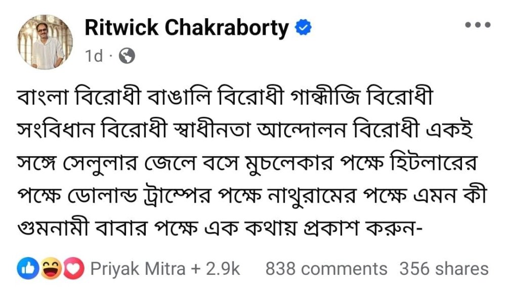 বাংলার পরিযায়ী শ্রমিকদের উপর বিভিন্ন রাজ্যে অত্যাচারের অভিযোগ উঠছে। বাংলা ভাষায় কথা বলায় তাঁদের বাংলাদেশি সন্দেহে অত্যাচার করা হচ্ছে। গত কয়েক মাসে এমন অভিযোগ বারে বারে উঠেছে। সম্প্রতি, বাংলা ভাষাকে ‘বাংলাদেশি’ তকমা দিয়ে চিঠি লেখায় বিরাট বিতর্কের মুখে দিল্লি পুলিশ। বঙ্গভবনে পাঠানো একটি চিঠিতে বাংলা ভাষাকে বাংলাদেশি ভাষা বলে উল্লেখ করেছে তারা। এ প্রসঙ্গে অননুকরণীয় ছন্দে কেন্দ্রকে কটাক্ষ করে ফেসবুকে একটি পোস্ট করেন অভিনেতা ঋত্বিক চক্রবর্তী। লেখেন, “বাংলা বিরোধী বাঙালি বিরোধী গান্ধীজি বিরোধী সংবিধান বিরোধী স্বাধীনতা আন্দোলন বিরোধী একই সঙ্গে সেলুলার জেলে বসে মুচলেকার পক্ষে হিটলারের পক্ষে ডোলান্ড ট্রাম্পের পক্ষে নাথুরামের পক্ষে এমন কী গুমনামী বাবার পক্ষে এক কথায় প্রকাশ করুন-”