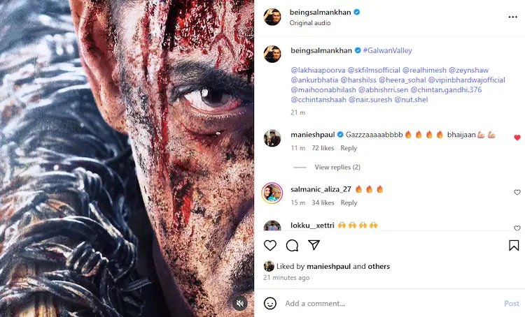 ‘ব্যাটেল অফ গলওয়ান’-এর এই নয়া পোস্টার, তার উপর সলমনের নয়া লুক দেখে সোশ্যাল মিডিয়া ভরে উঠল মন্তব্যে। অভিনেতা মনীশ পল প্রথম সেলেবদের মধ্যে কমেন্ট করেন— " ওরে বাবা, দারুণ! ভাইজান!"আর এক ফ্যান লেখেন— "গলওয়ানে দুর্ধর্ষ কামব্যাক করতে চলেছেন সলমন!" তৃতীয়জন বলেন— "এর জন্য প্রস্তুত ছিলাম না!"