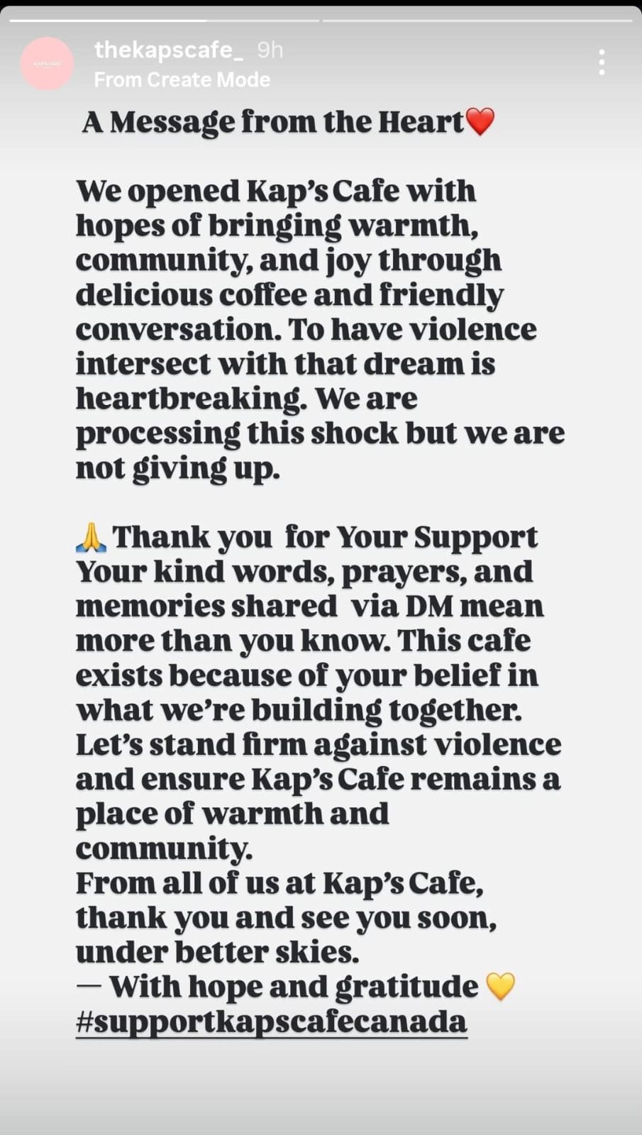 সম্প্রতি অজ্ঞাত পরিচয় বন্দুকধারীরা একাধিক গুলি চালিয়েছে। ঘটনার সময় ক্যাফেটি বন্ধ ছিল, ফলে কোনও প্রাণহানির খবর নেই। তবে এই ঘটনায় ব্যাপক চাঞ্চল্যের সৃষ্টি হয়েছে। সূত্রের খবর, স্থানীয় সময় রাত প্রায় একটা নাগাদ কয়েকজন হামলাকারী ক্যাফের সামনে এসে পরপর গুলি চালাতে শুরু করে। গুলির শব্দ শুনে আশেপাশের মানুষজন আতঙ্কিত হয়ে পড়েন এবং পুলিশে খবর দেন। কানাডিয়ান পুলিশ ঘটনার তদন্ত শুরু করেছে এবং সিসিটিভি ফুটেজ খতিয়ে দেখা হচ্ছে। পুলিশ জানিয়েছে, মোট ছয় রাউন্ড গুলি চালানো হয়েছে। বৃহস্পতিবার এই খবর ছড়িয়ে পড়তেই উত্তেজনা ছিল সমাজমাধ্যমে।