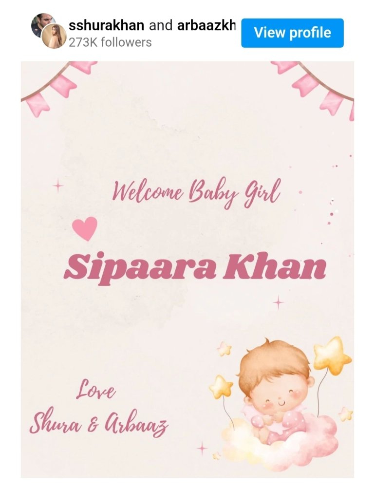 ইতিমধ্যেই শুরা ইনস্টাগ্রামে জানিয়েছেন তাঁদের কন্যার নাম— সিপারা খান। আরবি ভাষায় এই নামের অর্থ ' সুন্দরী নারী', ফার্সি ভাষায় এর অর্থ 'ফুল' এবং হিন্দিতে 'সিপারা' ধর্মগ্রন্থ কোরানের ৩০টি অংশের একটি অংশের নাম।