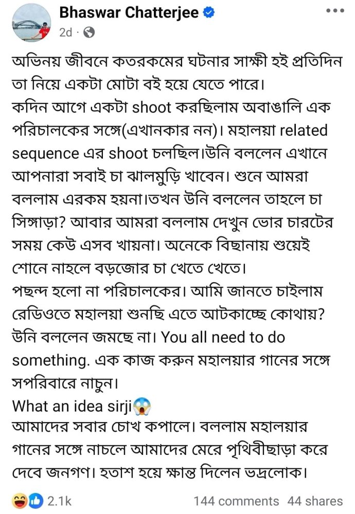 মাঝেমধ্যেই ব্যক্তিগত জীবনের কয়েক পশলা নানান রঙের ঘটনা সমাজমাধ্যমে ভাগ করে নেন অভিনেতা ভাস্বর চট্টোপাধ্যায়। কখনও সখনও তাঁর সেইসব পোস্টে উঠে আসে নিজস্ব ভাবনা, প্রতিবাদ। সম্প্রতি, সেরকমই একটি পোস্ট করেছেন অভিনেতা যা প্রথম ঝলকে মজাদার মনে হলেও তার গভীরে লুকিয়ে রয়েছে অন্য বার্তা। এক অবাঙালি পরিচালকের নির্দেশনায় পুজো সংক্রান্ত একটি শুটিং করতে গিয়ে কী কী সমস্যার সম্মুখীন হতে হয়েছিল তাঁকে, সেটাই এই পোস্টের প্রধান উপজীব্য।