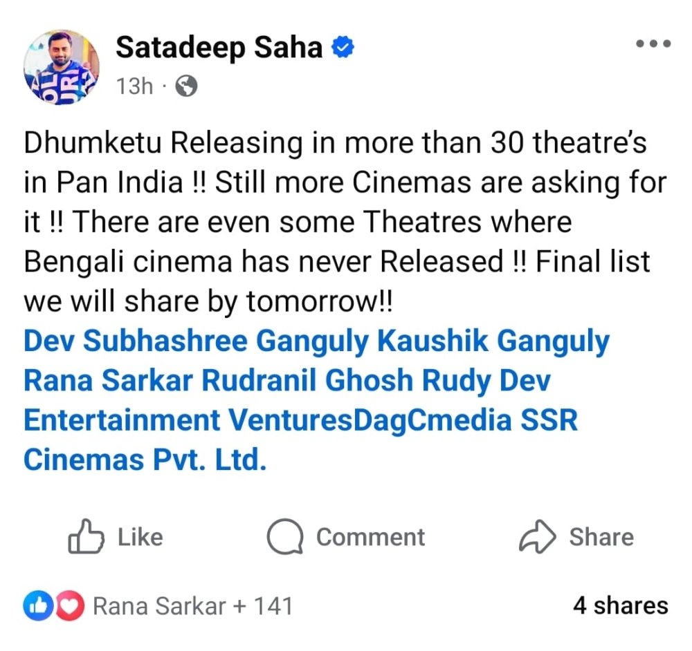 পরিবেশক শতদীপ সাহা ফেসবুকে একটি পোস্ট করে জানিয়েছেন, দিন গড়ানোর সঙ্গে সঙ্গে আরও বেশি সংখ্যক হল মালিকরাই ‘ধূমকেতু’ প্রদর্শনের ইচ্ছা প্রকাশ করছেন। অর্থাৎ বাংলা ছবির জন্য একেবারে নতুন দিগন্ত খুলে দিতে চলেছেন দেব। আগামীকালই সেই চূড়ান্ত তালিকা প্রকাশ করা হবে, কোথায় কোথায় মুক্তি পাচ্ছে এই ছবি। শতদীপের সেই পোস্ট ভাগ করে নিয়েছেন ‘ধূমকেতু’ ছবির পরিচালক কৌশিক গাঙ্গুলি।
