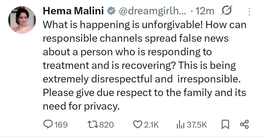 মঙ্গলবার সকাল সকাল ফের রটে যায় ধর্মেন্দ্রর মৃত্যুর খবর। আর বারংবার এই ঘটনায় ক্ষুব্ধ অভিনেতার বাড়ির লোকজন। হেমা মালিনী এদিন ক্ষোভ উগরে এক্স অর্থাৎ যা আগে টুইটার নামে পরিচিত ছিল সেখানে লেখেন, 'যেটা ঘটছে যে ক্ষমার অযোগ্য। সংবাদমাধ্যম কীভাবে এভাবে ভুয়ো খবর ছড়াতে পারে তাও এমন একজনকে নিয়ে যিনি চিকিৎসায় সাড়া দিচ্ছেন এবং সুস্থ হয়ে উঠছেন? এটা অত্যন্ত অসম্মানজনক এবং দায়িত্বজ্ঞানহীনের মতো কাজ। পরিবারকে সম্মান দিন। আমাদের প্রাইভেসি দিন।'
