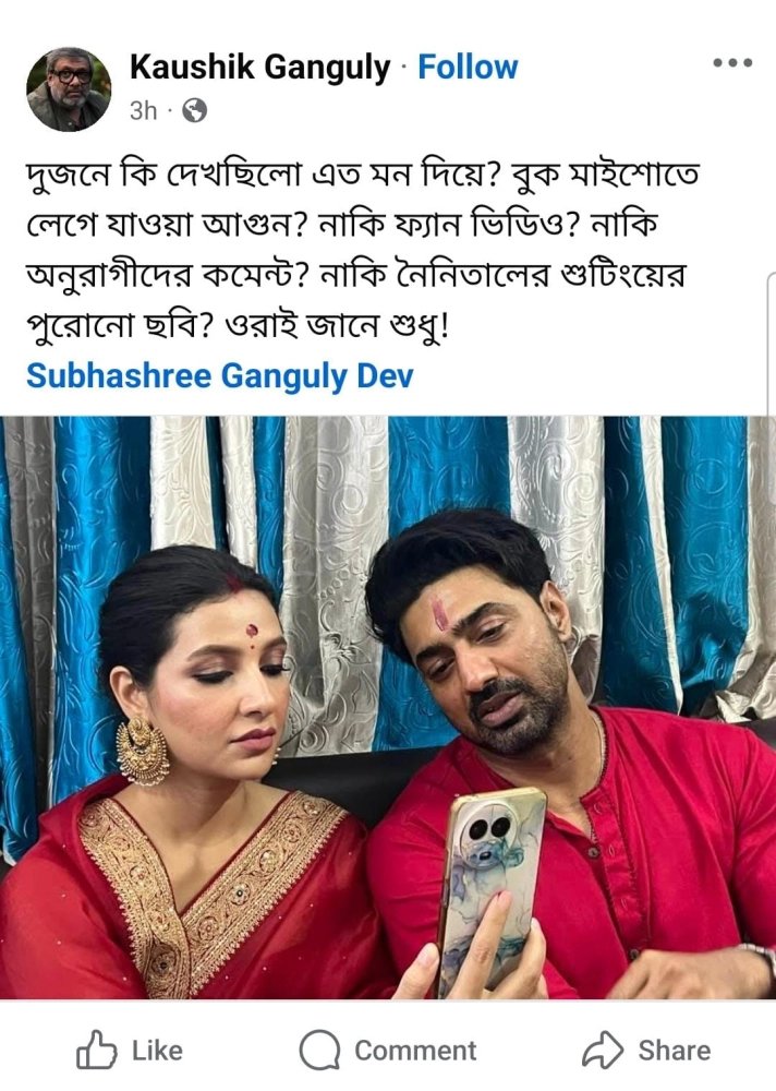 কী নিয়ে হচ্ছিল কথা? কীসেই বা ডুবে ছিল ‘দেশু’ জুটি? কৌশিকও উৎসুক। তিনি লেখেন? ‘দুজনে কি দেখছিলো এত মন দিয়ে? বুক মাইশোতে লেগে যাওয়া আগুন? নাকি ফ্যান ভিডিও? নাকি অনুরাগীদের কমেন্ট? নাকি নৈনিতালের শুটিংয়ের পুরোনো ছবি? ওরাই জানে শুধু!’ (পোস্টের বানান অপরিবর্তিত)