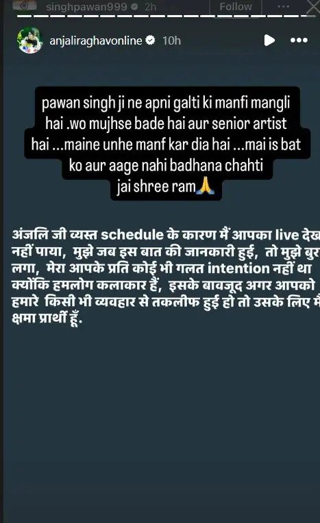 ক্ষমা করলেন বটে অঞ্জলি, কিন্তু তাঁর প্রতিক্রিয়ায় ক্ষোভও স্পষ্ট। অঞ্জলি রাঘব তাঁর ইনস্টাগ্রাম স্টোরিতে পবনের ক্ষমা প্রার্থনার পোস্ট শেয়ার করে লিখেছেন—“পবন সিংজি নিজের ভুল মেনে নিয়েছেন এবং ক্ষমা চেয়েছেন। উনি আমার থেকে বড় এবং সিনিয়র আর্টিস্ট। আমি ওঁকে ক্ষমা করে দিলাম। আমি এই প্রসঙ্গকে আর বাড়াতে চাই না। জয় শ্রী রাম।”