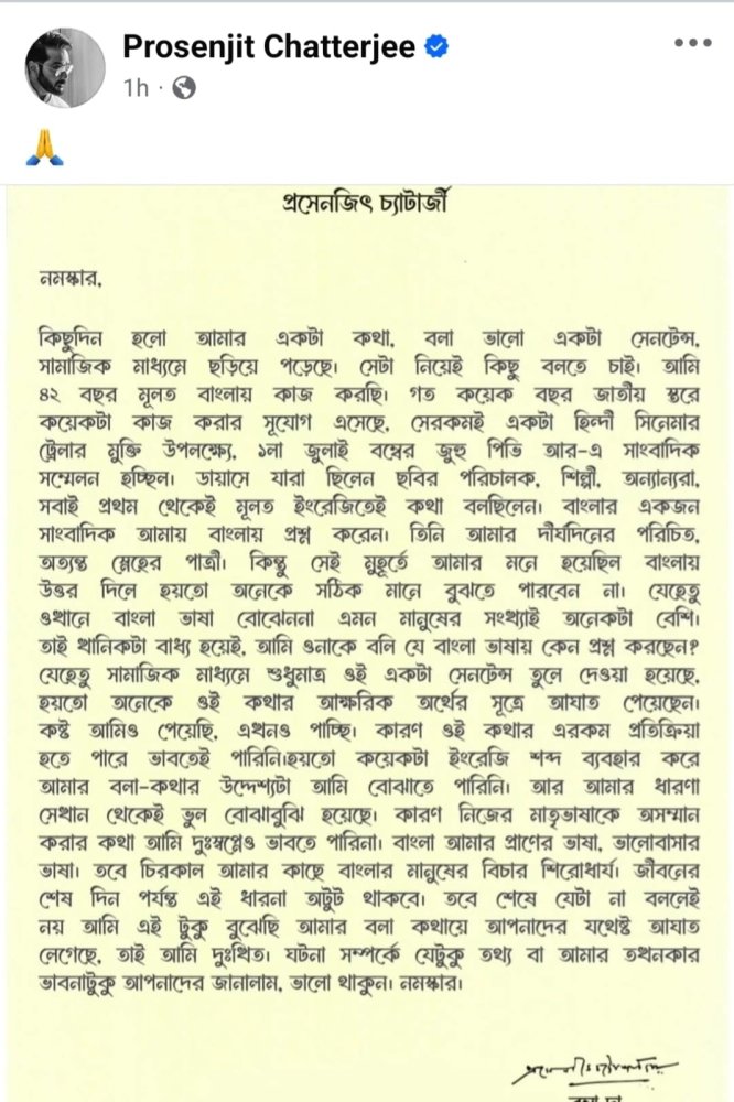 তিনি আরও লেখেন— “একটা বাক্য তুলে ধরে অনেকেই হয়তো আঘাত পেয়েছেন। আমিও কষ্ট পেয়েছি, এখনও পাচ্ছি। কারণ নিজের মাতৃভাষাকে অসম্মান করার কথা আমি দুঃস্বপ্নেও ভাবতে পারি না। বাংলা আমার প্রাণের ভাষা। ভালবাসার ভাষা। বাংলার মানুষের বিচার চিরকাল আমার কাছে শিরোধার্য ছিল, থাকবে।"