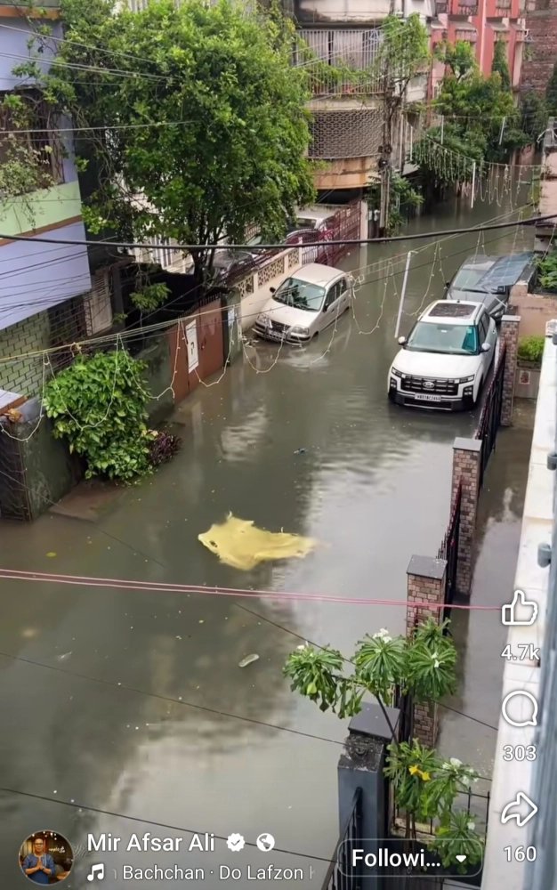 পিছিয়ে নেই রাণা সরকারও। নিজের বাড়ি অথবা অফিসের সিঁড়ির একটি ছোট্ট রিল পোস্ট করেছেন সমাজমাধ্যমে। দেখা যাচ্ছে, বৃষ্টির জল ঝরনার মতো তীব্রবেগে পড়েই চলেছে। দৃশ্যর সঙ্গে অদ্ভুত মিল 'টাইটানিক' ছবির একটি দৃশ্যের - যখন জাহাজটি ডুবছিল, তার খোলের মধ্যে নীচের তলায় সমুদ্রের জল যেভাবে ঝাঁপিয়ে পড়ে ডুবিয়ে দিচ্ছিল সবকিছু। রিলের সঙ্গে অবশ্য রাণা লিখেছেন, " এইমুহুর্তে কলকাতার সবথেকে সুন্দর সাউণ্ড স্টুডিও এটাই!"