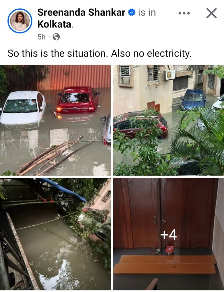শ্রীনন্দা শঙ্কর একাধিক ছবি ও ভিডিও পোস্ট করে দেখিয়েছেন, তাঁর আবাসনের উঠোন চত্বরে প্রায় এক বুক জল। দাঁড় করানো একাধিক গাড়ির অর্ধেক ডুবে রয়েছে জল। নীচের প্যান্ডেলের বাঁশ পর্যন্ত ভেসে যাচ্ছে জলের তোড়ে। এরপর ভিডিওতে দেখা গেল, তাঁর বাড়ির পরিচারকদের হাল-হকিকৎ খোঁজ খবর করতে করতে তিনি দেখালেন তাঁদের বাড়ির নাচের অনুশীলনের ঘরেও ঢুক পড়েছে জল! এবং রীতিমতো ভাসছে সবকিছু!
