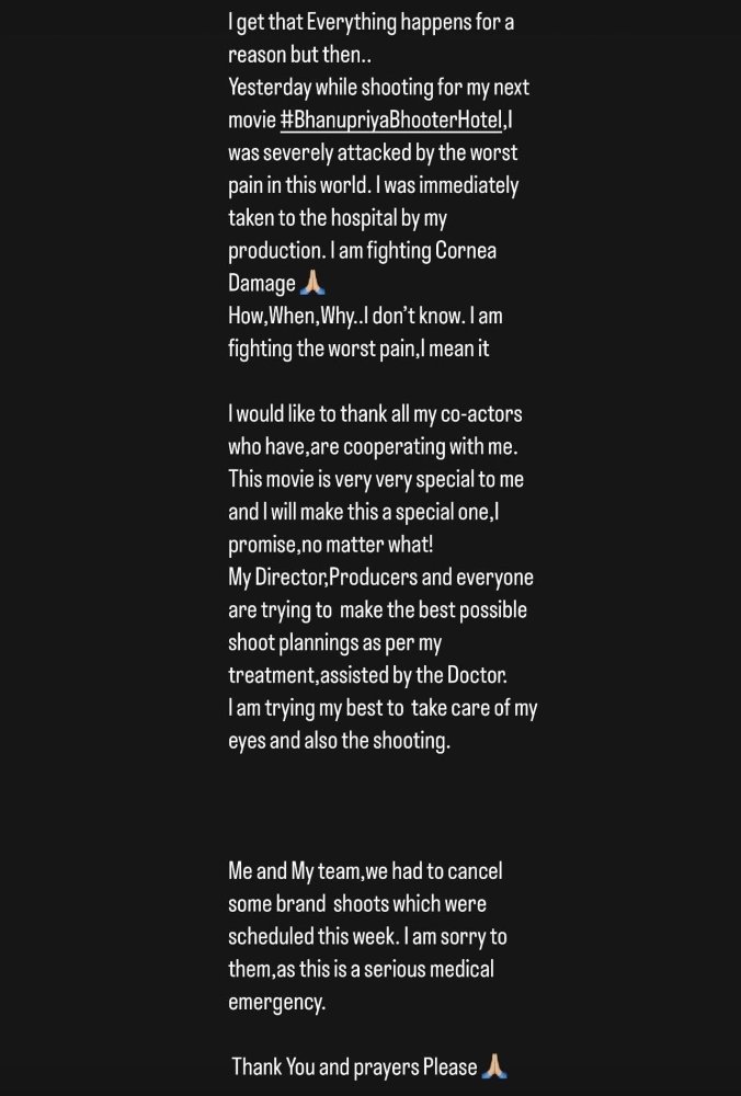 তিনি আরও লেখেন, 'প্রযোজনা সংস্থার লোকজন আমাকে তাৎক্ষণিকভাবে হাসপাতালে নিয়ে যায়। আমি কর্নিয়ায় সাংঘাতিক ক্ষতর সঙ্গে এখন লড়াই করছি। এটা কীভাবে, কখন, কেন ঘটল তা আমি জানি না। আমার সকল সহ-অভিনেতাদের ধন্যবাদ জানাতে চাই যাঁরা আমাকে সহযোগিতা করছেন। এই ছবিটি আমার কাছে খুবই বিশেষ এবং আমি এটিকে একটি বিশেষ করে তুলব, আমি প্রতিশ্রুতি দিচ্ছি, যাই হোক না কেন!'