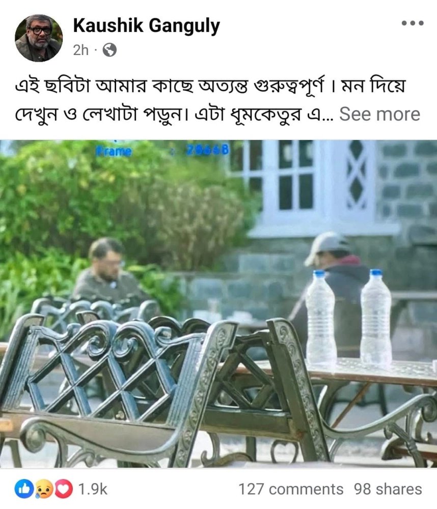 কৌশিক গাঙ্গুলি লিখেছেন – “এই ছবিটা আমার কাছে অত্যন্ত গুরুত্বপূর্ণ । মন দিয়ে দেখুন ও লেখাটা পড়ুন। এটা ধূমকেতুর একটা দৃশ্যের শট্ । যেখানে নৈনিতালের একটা ক্যাফেতে দেব ও শুভশ্রীর দেখা হয়, কিন্তু শুভশ্রী চিনতে পারেনা বৃদ্ধ দেবকে। লক্ষ্য করবেন টেবিলে বসে আছেন দুজন ব্যক্তি । তাঁদের সামনের টেবিলে দুটো খালি জলের বোতল রাখা। সেই দুটো বোতলের পিছনে টুপি মাথায় একজন ও উল্টোদিকে বসে হাল্কা দাড়িমুখে আরেকজন। নিজেদের কাজে ব্যস্ত। এঁরা দুজনেই আমাদের ইউনিট মেম্বার ছিলেন নৈনিতালে। বাইরে কোথাও শুটিং করতে গেলে হামেশাই ফ্রেমের প্রয়োজনে ইউনিটের সহকর্মীদের অনুরোধ করে বসতে বা হেঁটে যেতে বলা হয়। এটাও তেমনি। টুপি মাথায় যিনি তাঁর নাম সঞ্জয় ভট্টাচার্য, প্রোডাকশন ডিপার্টমেন্টের বন্ধু ও উল্টোদিকে বসা ভদ্রলোক বিখ্যাত মেকআপ আর্টিস্ট বিক্রম গায়কোয়াড়জী। ১০ বছর পর যখন ধূমকেতু মুক্তি পেয়েছে, তখন ঐ টেবিলে বসা দুজন মানুষই আর আমাদের মধ্যে নেই।অন্যান্য টেবিলে আরো অন্য ইউনিট মেম্বার ফ্রেম ভরাট করতে বসেছিলেন। কিন্তু কেন যে ঐ দুজনকেই বেছে ঐ একই টেবিলে বসিয়েছিলাম তার কোনো উত্তর পাচ্ছিনা! ছবির ফাইনাল প্রিভিউ করতে গিয়ে এটা ধরা পড়ে আমার চোখে।সত্যি গায়ে কাঁটা দিয়ে ওঠে। আরো অস্বস্তি হয় সামনে রাখা দুটো খালি জলের বোতল দেখে।ওটা রূপক নাকি কাকতালীয়! আমরা তো আমাদের দৃশ্য সাজিয়েছিলাম আমাদের সিনেমার জন্য! কিন্তু অলক্ষ্যে কেউ কি টেবিল সাজিয়ে নিয়েছিলো তাঁর নিজের চিত্রনাট্য অনুযায়ী! নইলে ঐ একই টেবিলে বসা দুজনেই আজ কেন নেই আমাদের মধ্যে? দুটো খালি বোতল কেন ওখানেই রাখা? যতদিন সিনেমা বানাবো, এই ফ্রেমটা তাড়িয়ে নিয়ে বেড়াবে।