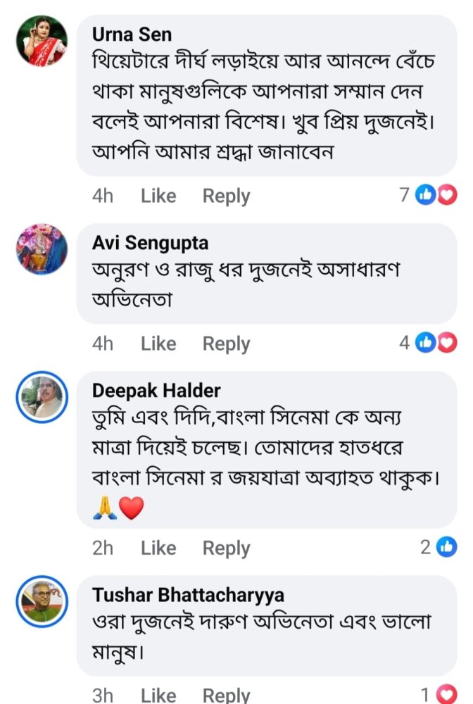 স্বভাবতই পরিচালকের তরফে এহেন প্রশংসা পেয়ে খুশি দুই অভিনেতা। অবশ্য বহু বছর ধরেই মঞ্চে এবং একাধিক ওয়েব সিরিজে কাজ করে চলেছেন এই দুই অভিনেতা। পরিচালকের সেই পোস্ট ফেসবুকে শেয়ার করে তাঁকে ধন্যবাদ জ্ঞাপন করেছেন রাজু এবং অনুরণ দু’জনেই।