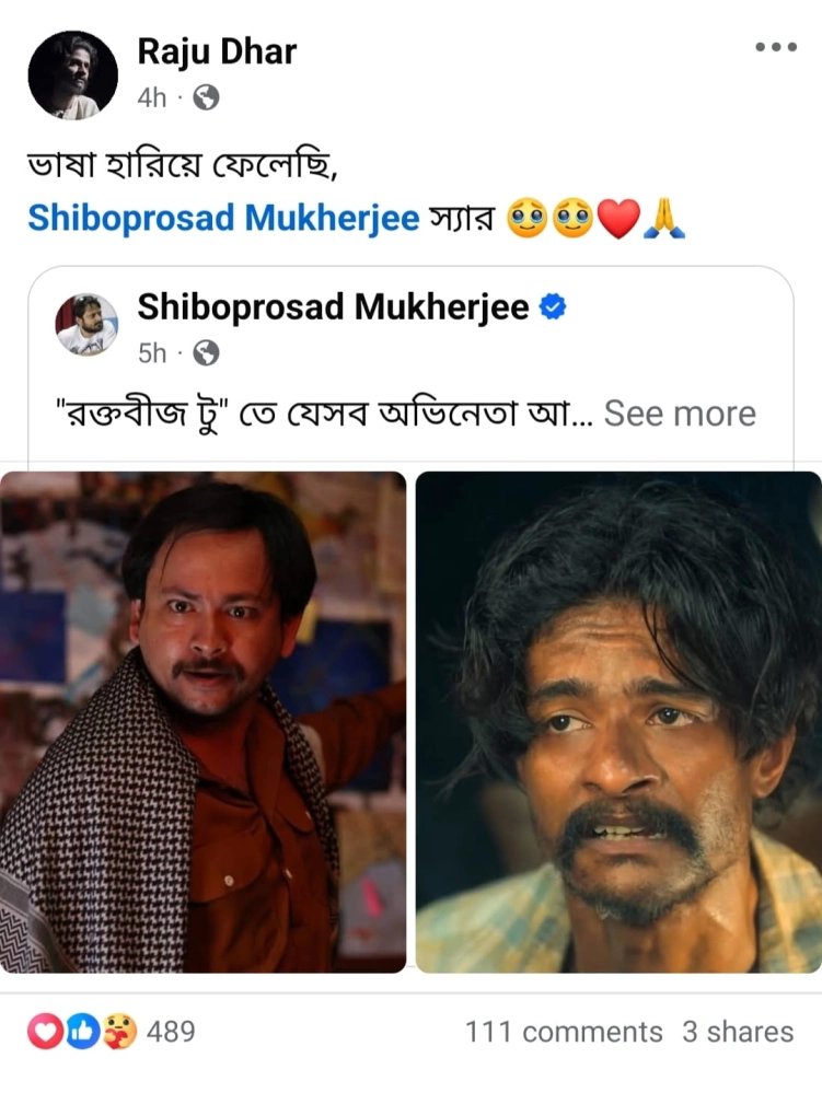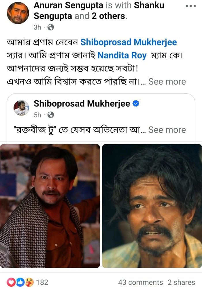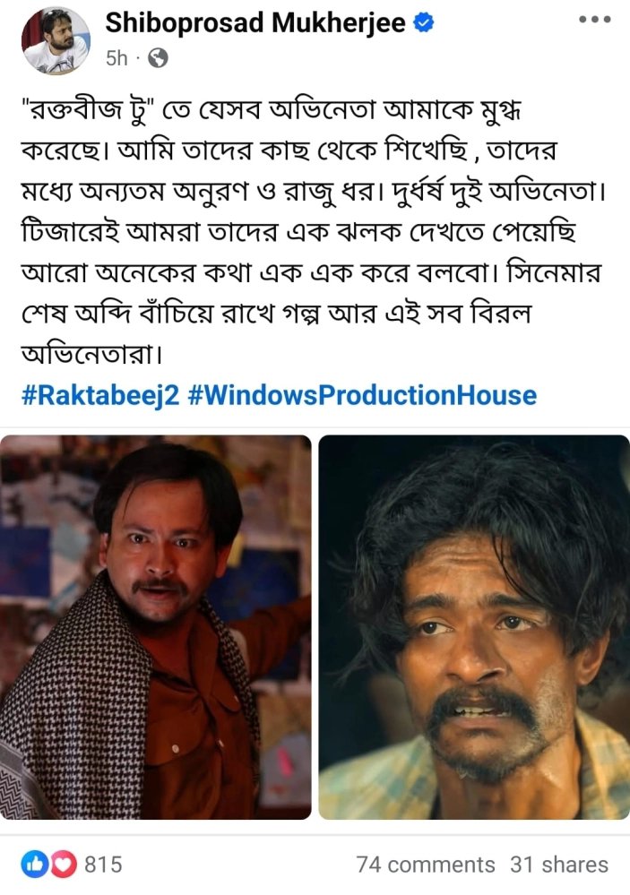 ‘রক্তবীজ ২’তে এই দুই অভিনেতার লুক শেয়ার করে শিবপ্রসাদ লেখেন – “ ‘রক্তবীজ টু’তে যেসব অভিনেতা আমাকে মুগ্ধ করেছে। আমি তাদের কাছ থেকে শিখেছি, তাদের মধ্যে অন্যতম অনুরণ ও রাজু ধর। দুর্ধর্ষ দুই অভিনেতা। টিজারেই আমরা তাদের এক ঝলক দেখতে পেয়েছি আরো অনেকের কথা এক এক করে বলবো। সিনেমার শেষ অব্দি বাঁচিয়ে রাখে গল্প আর এই সব বিরল অভিনেতারা।” (পোস্টের বানান অপরিবর্তিত রাখা হল)
