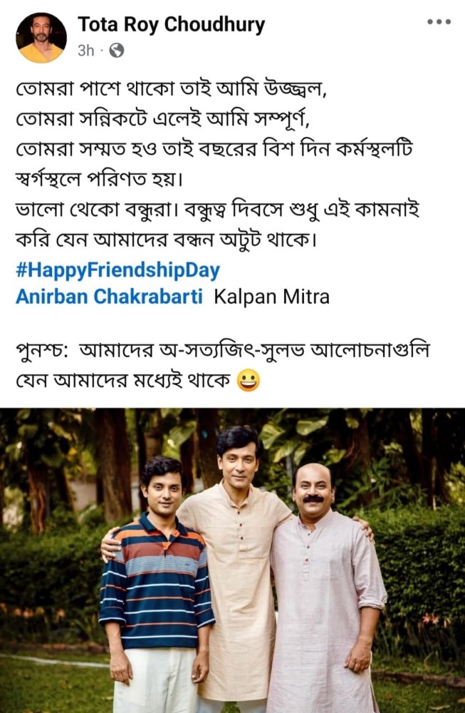 এদিন সমাজমাধ্যমে অভিনেতা অনির্বাণ চক্রবর্তী এবং কল্পনা মিত্রের সঙ্গে নিজের একটি ছবি পোস্ট করেছেন টোটা। এই ত্রয়ীর রসায়ন যে জনতামহলে ফেলুদা-তোপসে এবং জটায়ুর চরিত্রে দারুণ জনপ্রিয় সেকথা নতুন করে বলার নয়। ছবিতে দেখা যাচ্ছে, গাছগাছালির মধ্যে দাঁড়িয়ে ত্রিমূর্তি। মাঝখানে ফেলুদা বেশে পাঞ্জাবী,পাজামাতে টোটা, বাঁ পাশে পোলো টিশার্ট-ট্রাউজার্সে তোপসে এবং অন্যদিকে লালমোহন গাঙ্গুলি-র রূপসজ্জায় অনির্বাণ। দু'জনকেই সস্নেহে জড়িয়ে ধরে রয়েছেন ফেলুদা। সবার মুখেই আলতো করে লেগে রয়েছে এক চিলতে মিষ্টি হাসি। খুব সম্ভবত, এ ছবি ফেলুদার কোনও সিরিজের শুটিংয়ের ফাঁকেই তোলা। এই ত্রয়ীর রসায়ন ওয়েব সিরিজে যেমন জনপ্রিয়, বাস্তবেও তেমনই জমজমাট—তা আরও একবার প্রমাণ করে দিলেন টোটা।
