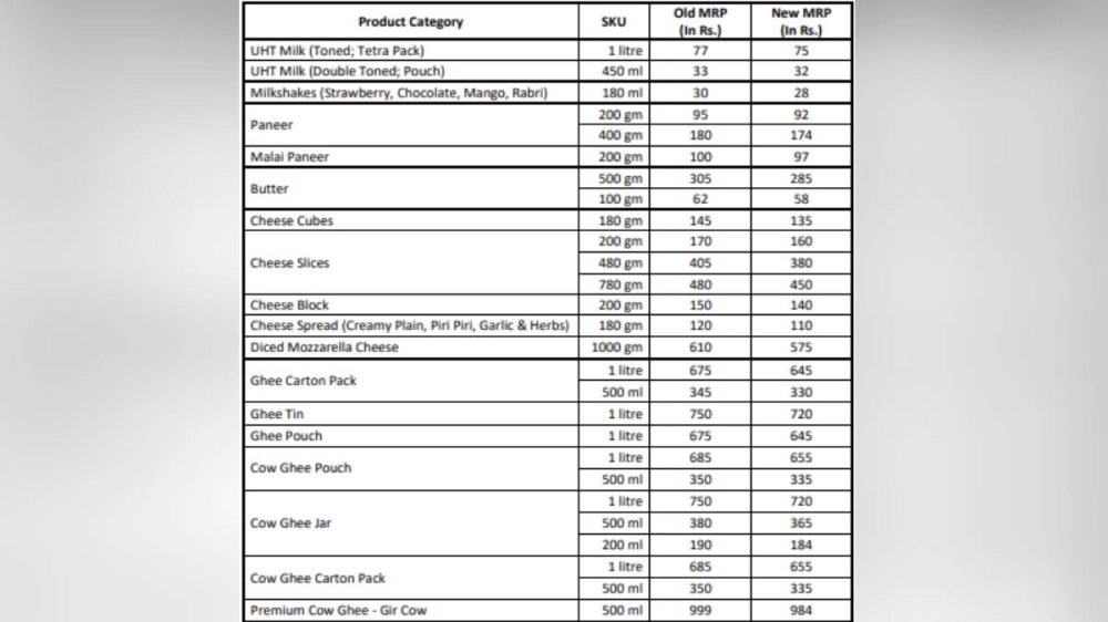 মাদার ডেয়ারির পনির, মাখন, ঘি, মিল্কশেক এবং আইসক্রিমের মতো নিত্যপ্রয়োজনীয় পণ্যের দামও কমছে। উদাহরণস্বরূপ, ৫০০ গ্রাম মাখনের দাম বর্তমানে ৩০৫ টাকা। জিএসটি চাড়ের ফলে তা কমে হচ্ছে ২৮৫ টাকা। বাটারস্কচ কোন আইনস্ক্রিমের দাম ৩৫ টাকা থেকে কমে হচ্ছে ৩০ টাকা।