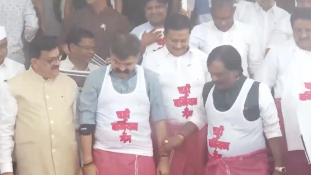 সোশ্যাল মিডিয়ায় প্রতিবাদ-ভিডিও ভাইরাল হয়েছে ইতিমধ্যে। ভিডিওতে দেখা যাচ্ছে, শিবসেনা (উদ্ধব বলহাসাহেব ঠাকরে) এমএলসি আম্বাদাস দানভে এবং এনসিপি (শরদ পাওয়ার শিবির) নেতা জিতেন্দ্র আওহাদ-সহ অন্যান্য নেতারা তাদের স্বাভাবিক পোশাকের উপরেই 'বানিয়া' এবং তোয়ালে 'লুঙ্গি' পরেছেন।