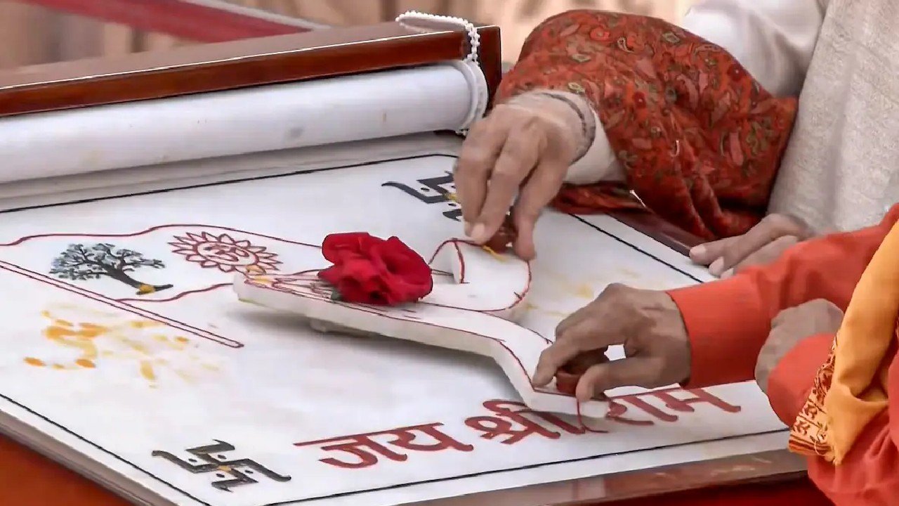 পুরোহিতরা বৈদিক রীতিনীতি পালন করার পর, প্রধানমন্ত্রী মোদি এবং মোহন ভাগবত ভাঁজ করা পতাকার পাশে রাখা 'নমস্কার' চিহ্নের দিকে যান। ওই হাতজোড় করে নমস্কার ভঙ্গিতে থাকা অংশটিকে পতাকার দিকে ঘুরিয়ে দিতেই, ধীরে ধীরে শুরু হয় পতাকা উত্তোলন পর্ব।