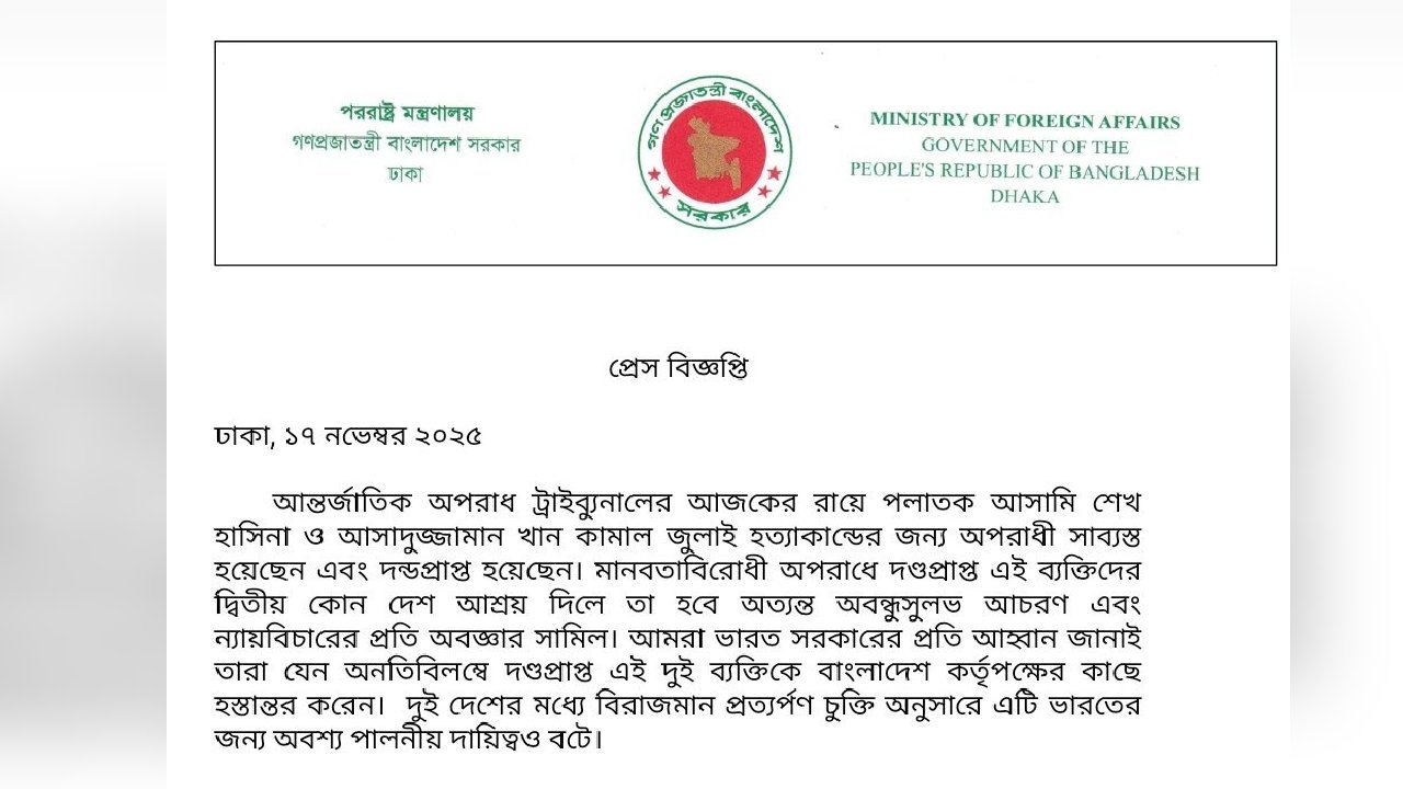 বাংলাদেশের বিদেশমন্ত্রকের জারি করা বিবৃতিতে লেখা হয়েছে, 'আন্তর্জাতিক অপরাধ ট্রাইব্যুনালের আজকের রায়ে পলাতক আসামি শেখ হাসিনা ও আসাদুজ্জামান খান কামাল জুলাই হত্যাকান্ডের জন্য অপরাধী সাব্যস্ত হয়েছেন এবং দন্ডপ্রাপ্ত হয়েছেন। মানবতাবিরোধী অপরাধে দণ্ডপ্রাপ্ত এই ব্যক্তিদের দ্বিতীয় কোন দেশ আশ্রয় দিলে তা হবে অত্যন্ত অবন্ধুসুলভ আচরণ এবং ন্যায়বিচারের প্রতি অবজ্ঞার সামিল।'