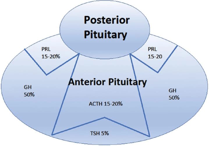পিটুইটারি গ্রন্থি দু’টি প্রধান ভাগে বিভক্ত: অ্যান্টেরিয়র (সামনের) ও পোস্টেরিয়র (পিছনের) লোব। মানুষের ক্ষেত্রে ইন্টারমিডিয়েট লোব থাকলেও তা স্বতন্ত্র অংশ হিসেবে গঠিত নয়। অ্যান্টেরিয়র লোব অপেক্ষাকৃত বড় এবং পুরো গ্রন্থির প্রায় ৮০% ওজন ধারণ করে।