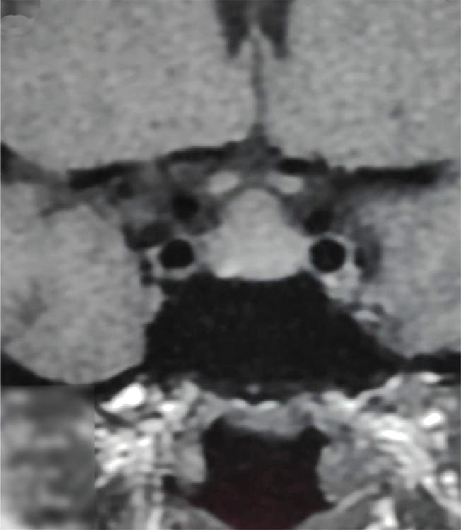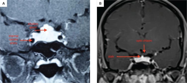 MRI-তে এই হাইপারপ্লাসিয়া সাধারণত গম্বুজ-আকৃতির ও সমমিত হয় এবং হোমোজেনাস সিগনাল ইন্টেনসিটি দেখায়, যেখানে সাধারণ নন-ফাংশনাল পিটুইটারি অ্যাডেনোমা নানা আকার ও অসমতা নিয়ে দেখা যায়।