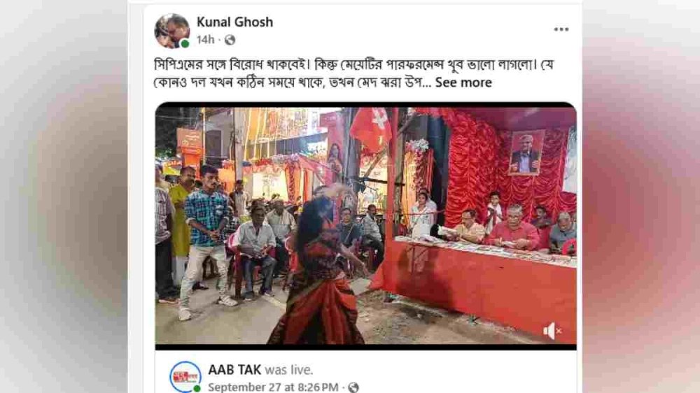 কুণালের সোশ্যাল মিডিয়া পোস্টে জানিয়েছেন, উত্তরপাড়ার কোনও এক পুজো মণ্ডপের কাছে সিপিআইএমের বইয়ের স্টলের বাইরে কবি সুকান্ত ভট্টাচার্যর রানার কবিতার সঙ্গে ছন্দে তাল মিলিয়ে নাচছিলেন ওই তরুণী।