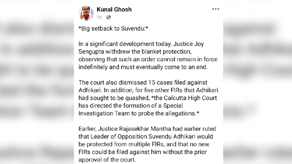 আদালতের রায় সামনে আসতেই এই প্রসঙ্গে মন্তব্য করেছেন তৃণমূল নেতা কুণাল ঘোষ। তিনি বলেন, 'কলকাতা হাইকোর্টে জোর ধাক্কা শুভেন্দু অধিকারীর। বিচারপতি মান্থা যে অনির্দিষ্টকালের রক্ষাকবচ দিয়ে গিয়েছিলেন, বিচারপতি জয় সেনগুপ্ত সেই রক্ষাকবচ প্রত্যাহার করে নিয়েছেন। খারিজ করে দিয়েছেন। অর্থাৎ তৃণমূল কংগ্রেস, রাজ্য সরকার যা বলছিল, তা মান্যতা পেয়েছে।'