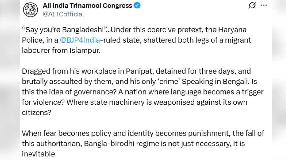সোশ্যাল মিডিয়ায় তৃণমূল পোস্ট করেছে সোমবার সন্ধেয়। তাতে লেখা হয়েছে, হরিয়ানার পানিপথে কারখানায় কাজ করতেন সাব্বির। সেখান থেকে তাঁকে তুলে নিয়ে যাওয়া হয়। বলা হয়, বলে দাও তুমি বাংলাদেশি। সাব্বির স্বীকার করেননি। নির্মম অত্যাচারে ভেঙে দেওয়া হয়েছে তাঁর দু’ পা। অল ইন্ডিয়া তৃণমূল কংগ্রেস লিখেছে ‘পানিপথে তাঁর কর্মক্ষেত্র থেকে টেনে নিয়ে যাওয়া, তিন দিন আটক রাখা এবং তাদের দ্বারা নির্মমভাবে লাঞ্ছিত করা, এবং তার একমাত্র 'অপরাধ' বাংলায় কথা বলা। এটাই কি শাসনব্যবস্থার ধারণা? এমন একটি দেশ, যেখানে ভাষা সহিংসতার সূত্রপাত করে? যেখানে রাষ্ট্রযন্ত্রকে তার নিজস্ব নাগরিকদের বিরুদ্ধে অস্ত্র হিসেবে ব্যবহার করা হয়?