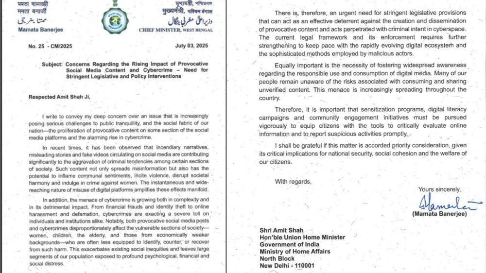 চিঠিতে মমতার আবেদন, সাইবারস্পেসে উস্কানিমূলক বিষয়বস্তু তৈরি এবং প্রচার এবং অপরাধমূলক উদ্দেশ্য নিয়ে সংঘটিত কর্মকাণ্ডের বিরুদ্ধে কার্যকর প্রতিরোধ হিসেবে কঠোর আইনী বিধানের জরুরি প্রয়োজন। এর পাশাপাশি, অনলাইন তথ্য মূল্যায়ন করা এবং সন্দেহজনক কার্যকলাপগুলি অবিলম্বে রিপোর্ট করার জন্য নাগরিকদের ডিজিটাল সচেতনতা বৃদ্ধি করাও জরুরি।