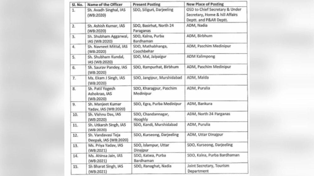 বদলির বিজ্ঞপ্তি ১৫ জন মহকুমা শাসককে। তালিকায়-শিলিগুড়ি, বসিরহাট, কালনা, মাথাভাঙা, মাল, রামপুরহাট, জঙ্গিপুর, খড়গপুর, এগরা, চন্দননগর, কান্দি, কার্শিয়াং, ইসলামপুর, কাটোয়া, রানাঘাট।